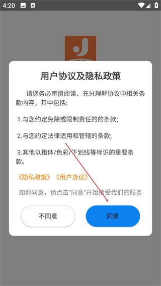 1、仔细阅读【用户协议及隐私政策】里关于责任限制、管辖等方面的条款,之后点击【同意】按钮,即可继续使用服务。