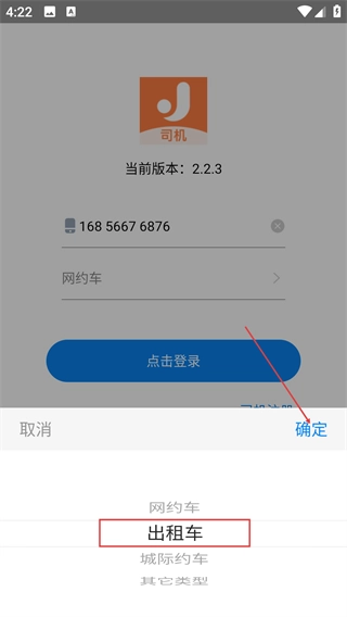 2、在当前版本(2.2.3)的登录页面,确认显示的号码无误后,点击【网约车】选项即可切换服务类型。