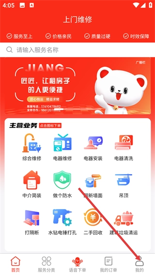 进入上门维修首页后,可选择“综合维修”“电器维修”等主营业务选项,发起对应服务的下单申请。