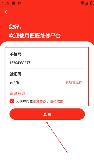 4、在登录页面,填写账号、验证码并勾选协议后,点击【登录】按钮,即可完成账号登录,使用更多功能。