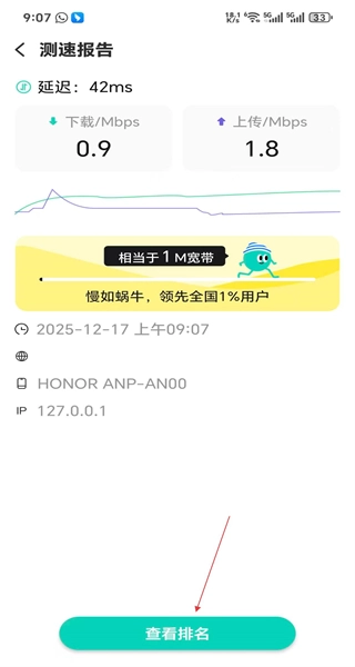 3、测速结束后进入测速报告页面,查看延迟与带宽的具体情况,点击“查看排名”按钮即可进入测速排行榜。