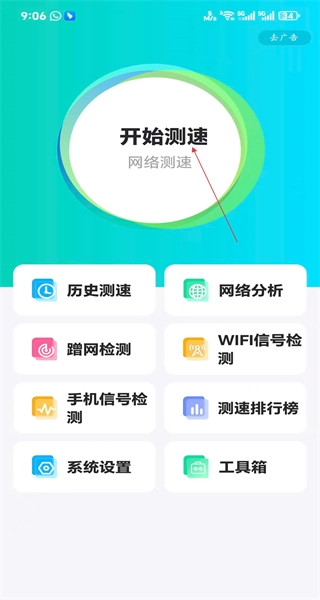 1、打开软件的首页后,点击“开始测速”按钮,即可进入网络测速的操作界面。