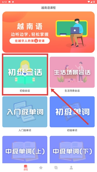 1、在越南语课程主页面,点击【初级会话】分类,进入相应的学习模块,就能从基础内容入手学习越南语会话。
