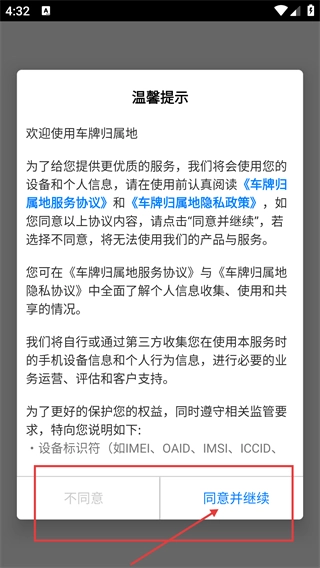 1、仔细阅读《车牌归属地服务协议》,随后点击弹窗里的【同意并继续】按钮,完成协议确认操作,以此来启用车牌归属地查询功能。