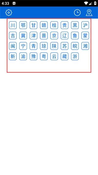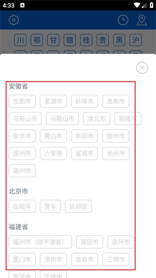2、进入省份简称选择界面后,点击对应省份的简称(例如“皖”代表安徽省),即可打开该省份的城市列表选择页面。
