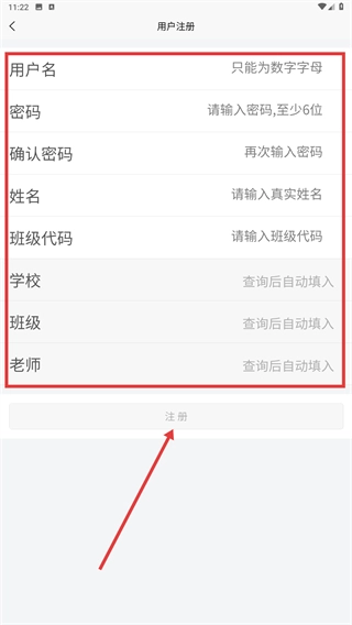3、在【用户注册】页面,填写【用户名】【密码】等相关信息,输入【班级代码】后,点击【注册】按钮即可完成账号创建。