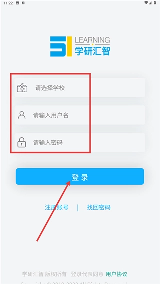 1、在【智汇听力】登录页面,先选择【请选择学校】,再填写【请输入用户名】和【请输入密码】,最后点击【登录】按钮进入系统。