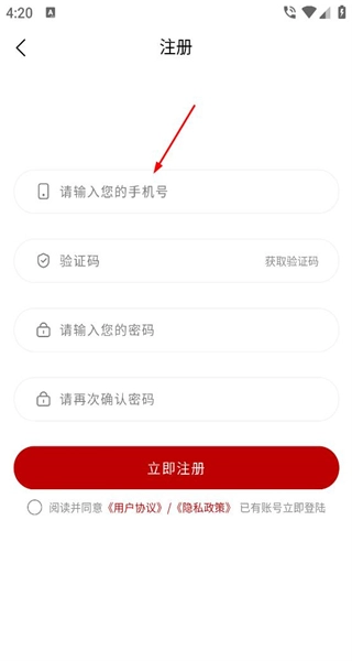 4、进入注册页面后,按顺序填写验证码与密码,勾选相关协议,随后点击对应按钮,即可完成账号注册操作。