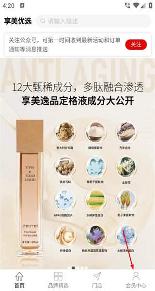 1、进入享美优选首页,能查看产品成分介绍,点击底部相应按钮,即可进入会员中心页面。
