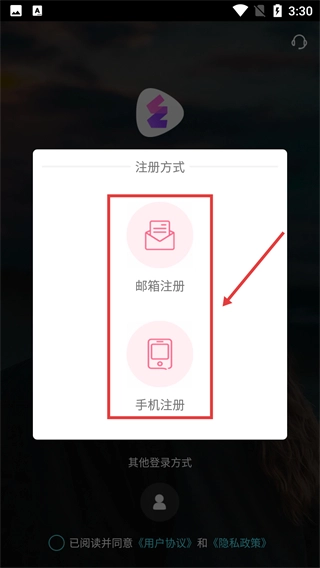 2、在【注册方式】弹窗里,选择【邮箱注册】或【注册】这两种方式中的任意一种,即可继续完成注册流程。