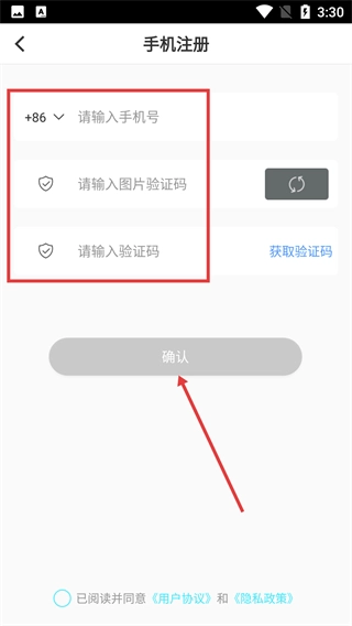 3、进入【注册】页面后,按顺序填写【+86-请输入号码】、【请输入图片验证码】以及【请输入验证码】,全部填写完毕后点击【确认】按钮。