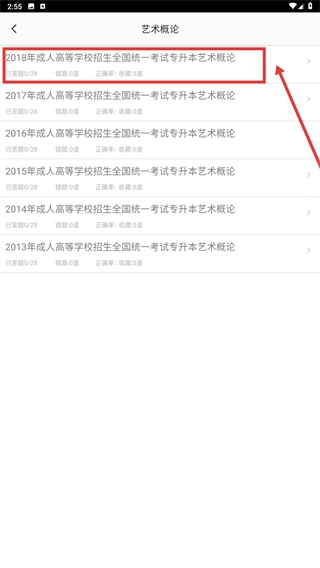 2、进入【艺术概论】题库后,挑选具体年份的试题(例如2018年),进入该套试卷的刷题筛选页面。