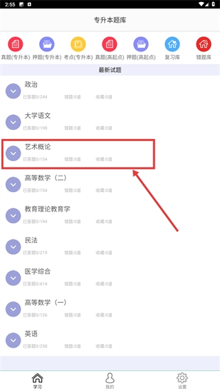 1、在【专升本题库】页面,选择【艺术概论】科目,即可查看该科目已答题、错题等数据,并进入对应的题库列表。