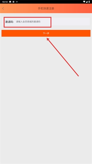 3、进入【快速注册】页面,在【邀请码-请输入会员商城的邀请码】输入框中填写邀请码,然后点击【下一步】按钮。