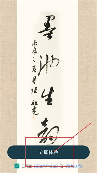 1、在应用的启动页面,勾选“已同意《墨池用户协议》及《隐私政策》”选项后,点击“立即体验”按钮,就能进入应用的主界面。