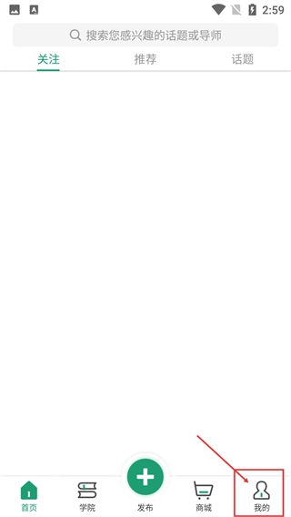 进入应用首页后,能看到【关注】【推荐】【话题】这些标签,点击底部的【我的】按钮,就能进入个人中心相关页面。