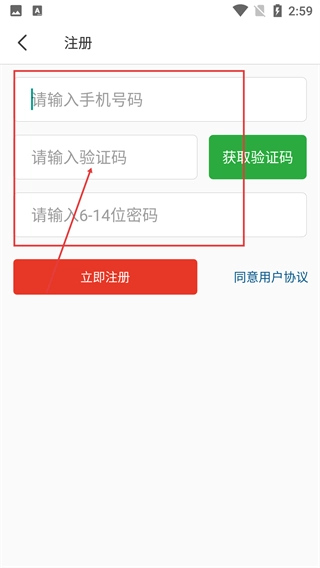4、进入注册页面后,在【请输入号码】的输入框中填写号码,点击【获取验证码】并输入收到的验证码内容,接着在【请输入6-14位密码】的输入框中设置符合要求的密码,最后点击【立即注册】按钮,即可完成注册操作。