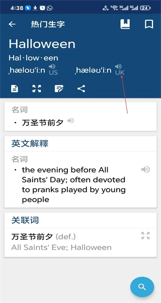 4、进入热门生字的详情页面,查看该词汇的发音、释义以及英文解释等内容,从而完成词汇查询。