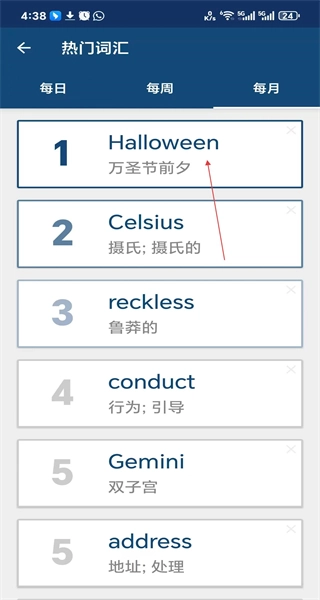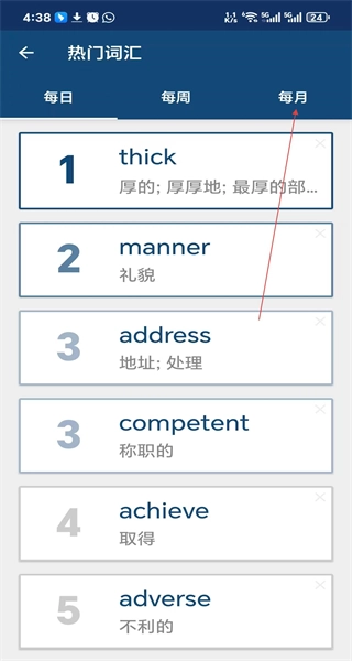 2、进入热门词汇页面,先看到每日热门词汇列表,接着找到“每月”选项,点击该选项即可切换至每月热门词汇列表。
