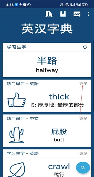 打开软件后,在界面上找到“学习生字”和“热门词汇”板块,接着在热门词汇英文部分的后方找到“更多”按钮,点击此按钮即可进入热门词汇页面。