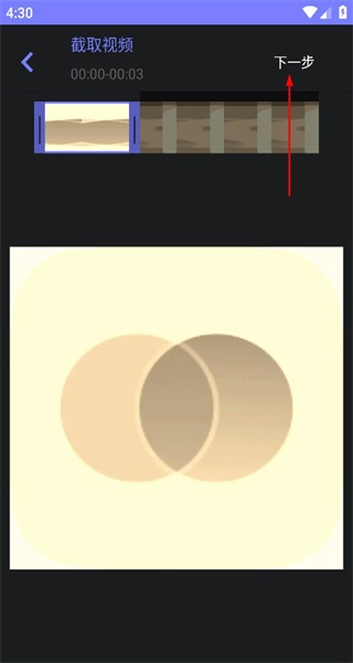 2、进入视频截取界面,调整需截取的视频片段范围,界面会显示截取时长,调整完毕后点击下一步。