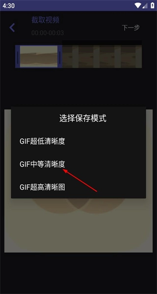 3、弹出选择保存模式的选项,包含GIF超低清晰度、GIF中等清晰度、GIF超高清晰图,选择对应清晰度选项以确定保存参数。