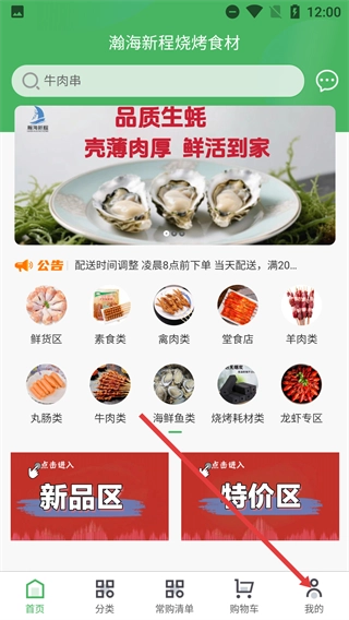 在【瀚海新程烧烤食材】页面,既可以利用搜索框搜索【牛肉串】,也能够从【鲜鲜区】等分类,或是【新品区】【特价区】来挑选食材。