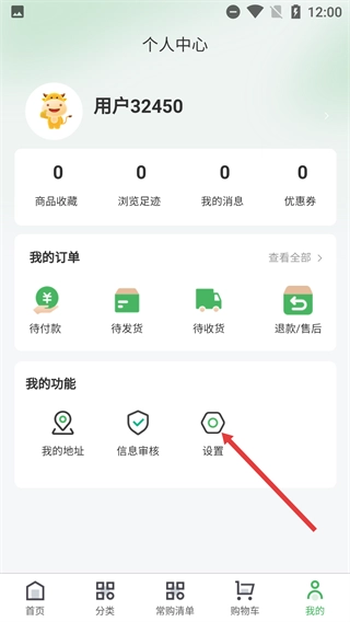 进入对应的页面后,既可以查看【用户32450】的订单状态,也能通过【设置】入口进入相关功能界面。