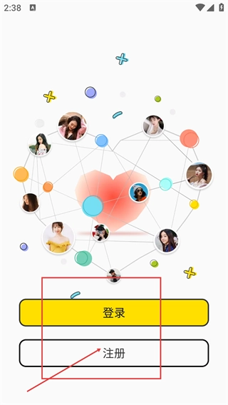1、打开应用进入初始界面,能看到头像组成心形的社交化设计,界面设有【登录】和【注册】两个操作入口,用户可根据需求选择相应功能。