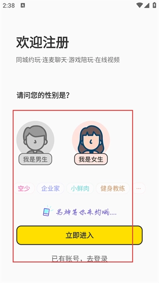 2、进入【欢迎注册】页面后,需要选择【我是男生】或【我是女生】的身份,选好对应标签后点击【立即进入】按钮,即可继续注册流程。