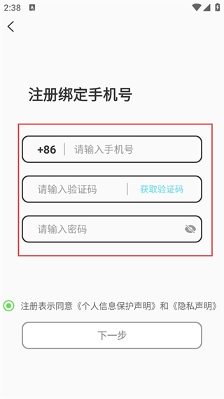 3、进入【注册绑定号】页面,需填写【+86-请输入号码】,获取并填写【验证码】,设置【密码】后即可点击下一步。