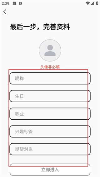 4、进入【最后一步-完善资料】页面后,可填写【昵称】【生日】等信息,其中【头像为非必填项】,填写完成后点击【立即进入】即可完成注册。