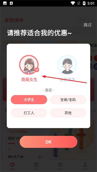 2、在优惠推荐弹窗里,挑选对应的性别(比如【我是女生】)和身份(比如【大学生】),选好后点击【OK】按钮确认。