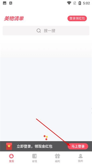 3、进入【美物清单】首页后,点击底部【立即登录-领现金红包】旁边的【马上登】按钮,就能进入登录流程参与红包领取。