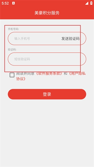 2、进入【美豪积分服务】页面,先填写【输入号】,接着点击【发送验证码】并填写收到的【短信验证码】,然后勾选相关协议,最后点击【登录】即可完成操作。