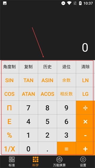 2、切换至科学模式后,能够调用【SIN】【TAN】【π】等科学计算功能,结合数字键可完成复杂运算的前期准备操作。