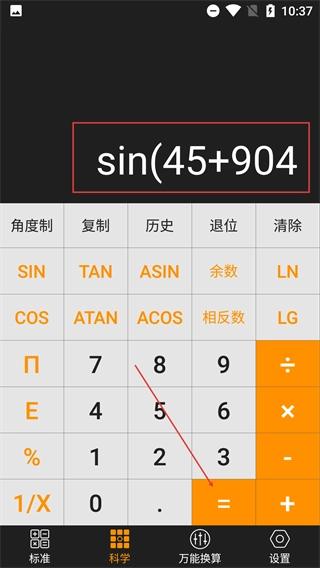 3、处于科学模式时,先按下【SIN】键,接着输入运算式(例如【45+904】),就能在输入区域呈现出对应的函数运算表达式。