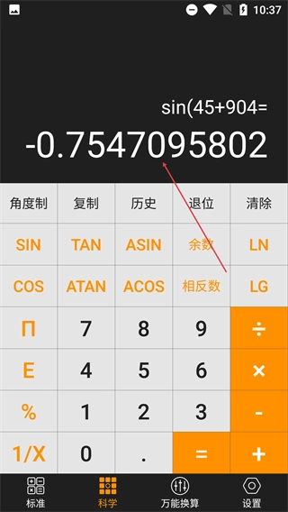 4、在输入函数运算式后,点击【=】键,就能看到运算结果(例如【-0.7547095802】),从而完成科学计算的操作。