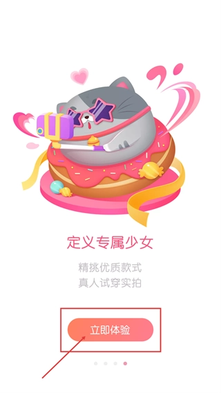 1、进入应用引导页后,能知晓其核心定位是“定义专属少女”,不仅提供优质款式,还配备真人试穿实拍内容,点击【立即体验】按钮即可进入应用主功能区。