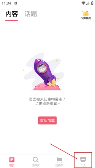 2、进入内容页面时,若出现加载失败的提示,可点击【重新加载】按钮进行重试,也可以通过底部导航栏的【个人】按钮进入对应的页面。
