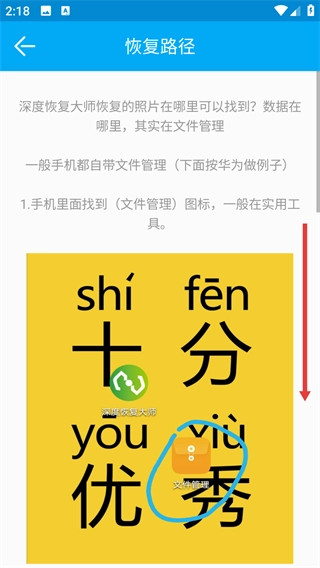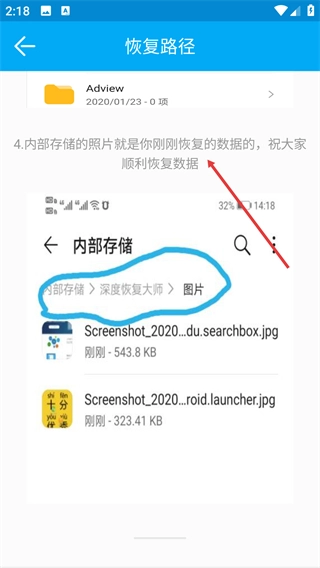 4、进入【文件管理】后,依次打开【内部存储】-【深度恢复大师】,就能找到恢复后的各类数据。