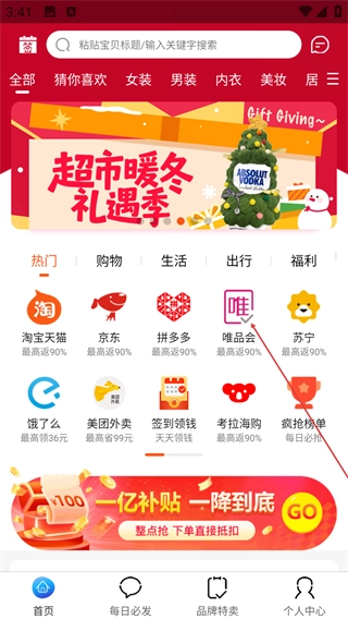 进入应用首页后,既可以利用搜索栏查找商品,也能选择【唯品会】等平台入口,从而进入相应平台的商品推荐页面。