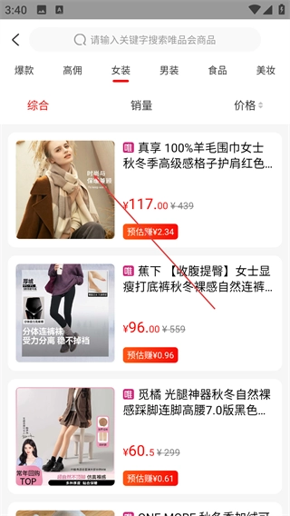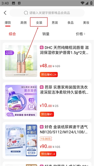 在商品页面点击【女装】分类标签,即可筛选出女装类商品的列表,进而查看商品的价格、预估收益等相关信息。