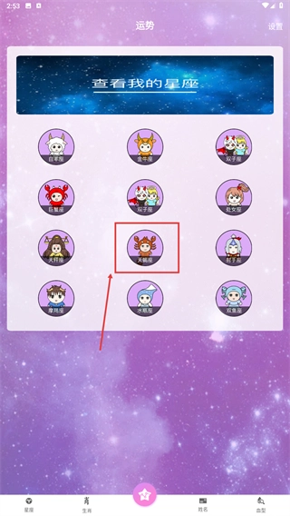 1、在【运势】页面,点击对应星座(例如天蝎座)的图标,即可进入该星座的运势详情查看界面。