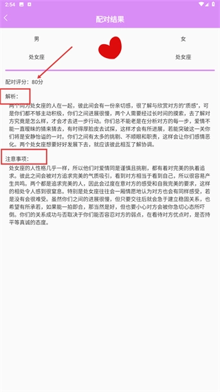 4、在配对结果页面,能够查看配对评分、解析以及注意事项,从而了解对应星座组合的相处建议。