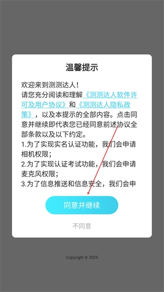 1、打开【测测达人】应用,仔细阅读并确认协议内容后,点击【同意并继续】按钮,就能完成协议确认步骤,进而使用应用的相关功能。