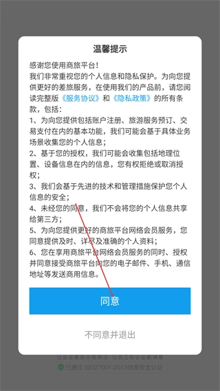 1、进入商旅平台后,需要阅读【温馨提示】里的【服务协议】与【隐私政策】,点击【同意】按钮才能继续使用服务。