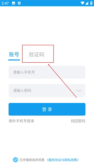 在登录界面,可切换【账号】或【验证码】登录方式,选择相应方式后填写对应信息,勾选协议后点击【登录】按钮即可。