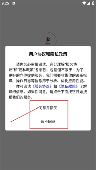1、请先仔细阅读【服务协议】与【隐私政策】,在确认对条款内容无异议后,点击【同意并接受】按钮,就能进入软件后续的操作流程。