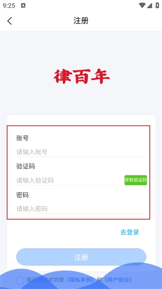 3、在注册页面里,按顺序填写【账号】,点击【获取验证码】并输入收到的验证码,接着设置【密码】,等所有信息都填写完毕后就能提交注册申请了。